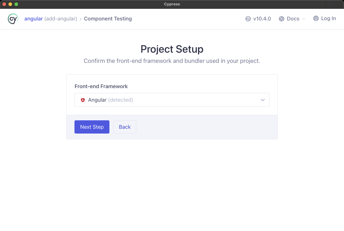 The Project Setup screen automatically detects your framework, which is Angular. Cypress Component Testing uses your existing development server config to render components, helping ensure your components act and display in testing the same as they do in production.